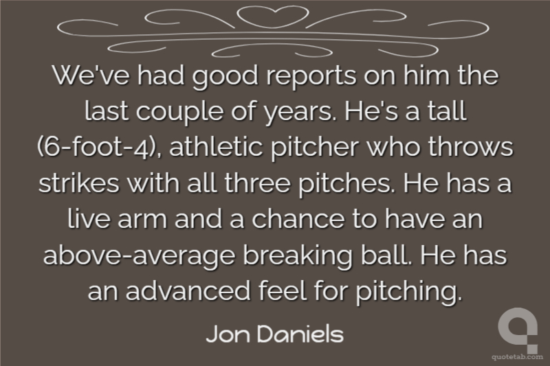 We've had good reports on him the last couple of years. He's a tall (6-foot-4), athletic pitcher who throws strikes with all three pitches. He has a live arm and a chance to have an above-average breaking ball. He has an advanced feel for pitching.