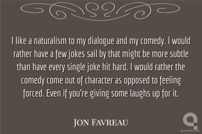 I like a naturalism to my dialogue and my comedy. I would rather have a few jokes sail by that might be more subtle than have every single joke hit hard. I would rather the comedy come out of character as opposed to feeling forced. Even if you're giving some laughs up for it.