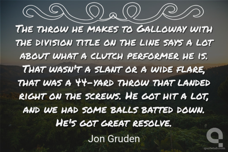 The throw he makes to Galloway with the division title on the line says a lot about what a clutch performer he is. That wasn't a slant or a wide flare, that was a 44-yard throw that landed right on the screws. He got hit a lot, and we had some balls batted down. He's got great resolve.