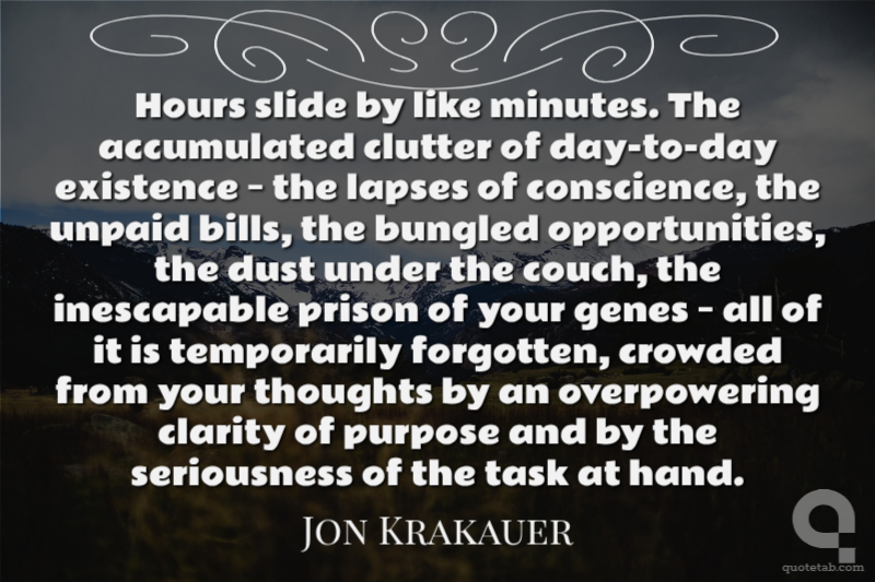 Hours slide by like minutes. The accumulated clutter of day-to-day existence — the lapses of conscience, the unpaid bills, the bungled opportunities, the dust under the couch, the inescapable prison of your genes — all of it is temporarily forgotten, crowded from your thoughts by an overpowering clarity of purpose and by the seriousness of the task at hand.