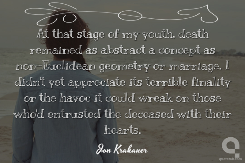 At that stage of my youth, death remained as abstract a concept as non-Euclidean geometry or marriage. I didn't yet appreciate its terrible finality or the havoc it could wreak on those who'd entrusted the deceased with their hearts.