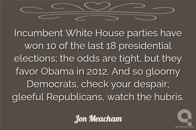 Incumbent White House parties have won 10 of the last 18 presidential elections; the odds are tight, but they favor Obama in 2012. And so gloomy Democrats, check your despair; gleeful Republicans, watch the hubris.