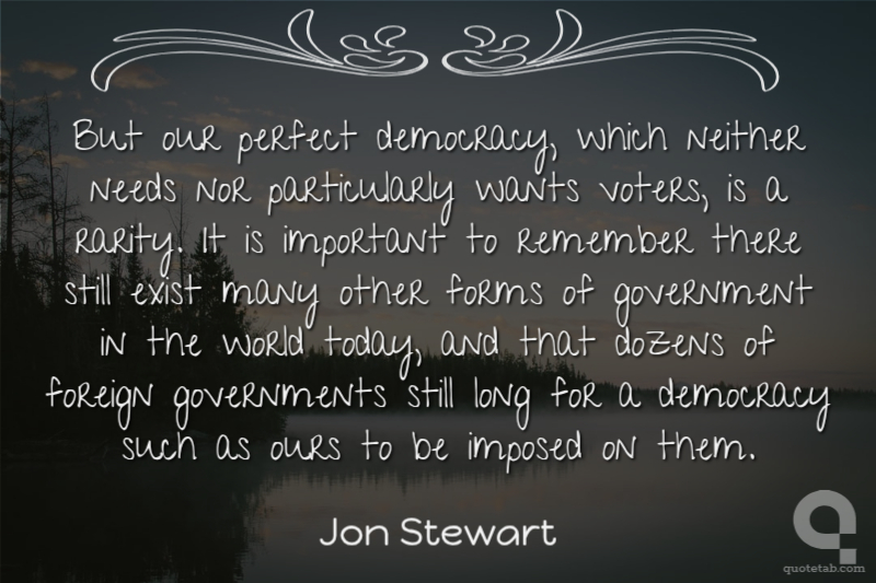 But our perfect democracy, which neither needs nor particularly wants voters, is a rarity. It is important to remember there still exist many other forms of government in the world today, and that dozens of foreign governments still long for a democracy such as ours to be imposed on them.