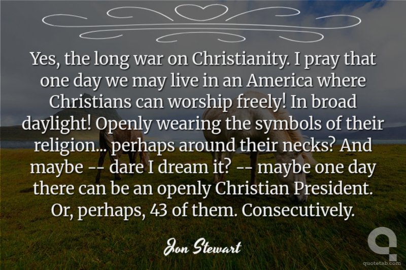 Yes, the long war on Christianity. I pray that one day we may live in an America where Christians can worship freely! In broad daylight! Openly wearing the symbols of their religion... perhaps around their necks? And maybe -- dare I dream it? -- maybe one day there can be an openly Christian President. Or, perhaps, 43 of them. Consecutively.