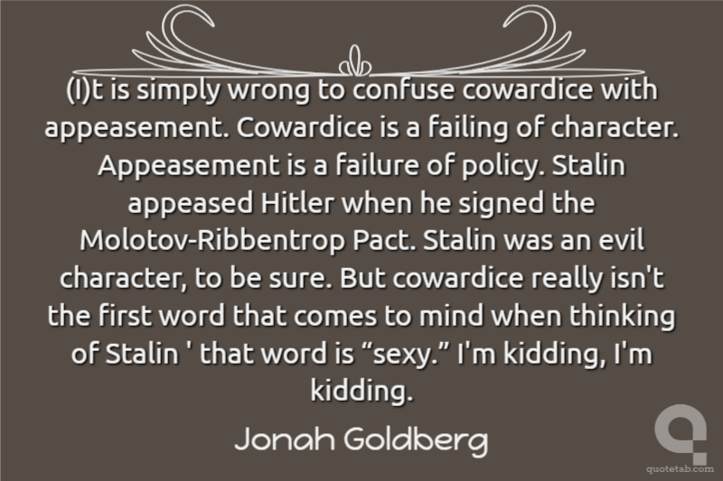 (I)t is simply wrong to confuse cowardice with appeasement. Cowardice is a failing of character. Appeasement is a failure of policy. Stalin appeased Hitler when he signed the Molotov-Ribbentrop Pact. Stalin was an evil character, to be sure. But cowardice really isn't the first word that comes to mind when thinking of Stalin ' that word is “sexy.” I'm kidding, I'm kidding.