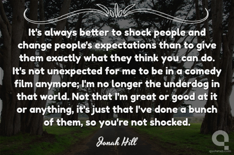 It's always better to shock people and change people's expectations than to give them exactly what they think you can do. It's not unexpected for me to be in a comedy film anymore; I'm no longer the underdog in that world. Not that I'm great or good at it or anything, it's just that I've done a bunch of them, so you're not shocked.