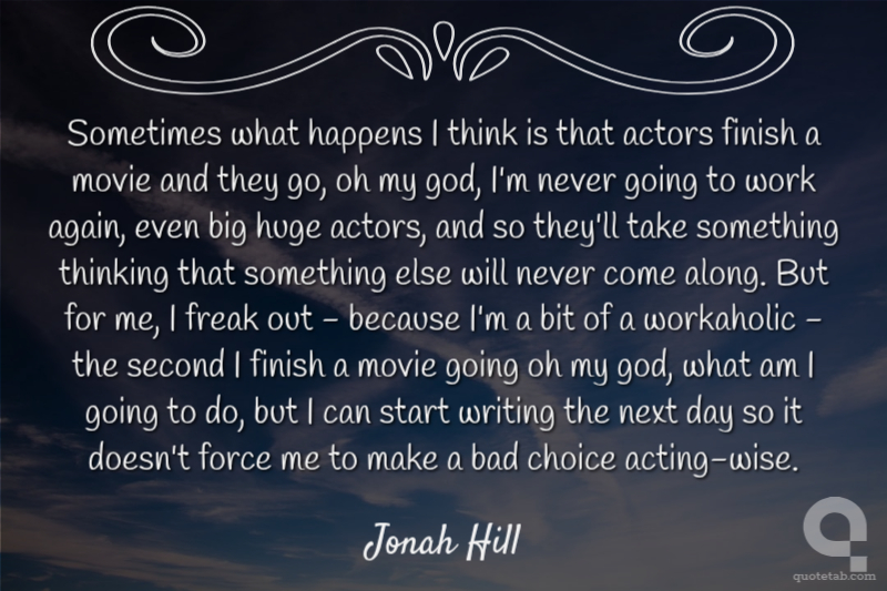 Sometimes what happens I think is that actors finish a movie and they go, oh my god, I'm never going to work again, even big huge actors, and so they'll take something thinking that something else will never come along. But for me, I freak out - because I'm a bit of a workaholic - the second I finish a movie going oh my god, what am I going to do, but I can start writing the next day so it doesn't force me to make a bad choice acting-wise.