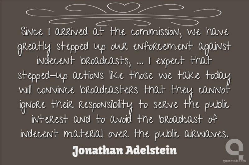 Since I arrived at the commission, we have greatly stepped up our enforcement against indecent broadcasts, ... I expect that stepped-up actions like those we take today will convince broadcasters that they cannot ignore their responsibility to serve the public interest and to avoid the broadcast of indecent material over the public airwaves.
