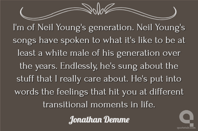 I'm of Neil Young's generation. Neil Young's songs have spoken to what it's like to be at least a white male of his generation over the years. Endlessly, he's sung about the stuff that I really care about. He's put into words the feelings that hit you at different transitional moments in life.