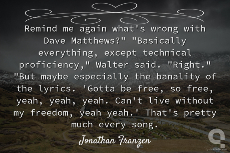 Remind me again what's wrong with Dave Matthews?" "Basically everything, except technical proficiency," Walter said. "Right." "But maybe especially the banality of the lyrics. 'Gotta be free, so free, yeah, yeah, yeah. Can't live without my freedom, yeah yeah.' That's pretty much every song.