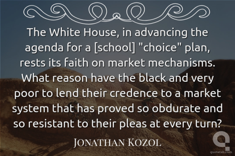 The White House, in advancing the agenda for a [school] "choice" plan, rests its faith on market mechanisms. What reason have the black and very poor to lend their credence to a market system that has proved so obdurate and so resistant to their pleas at every turn?