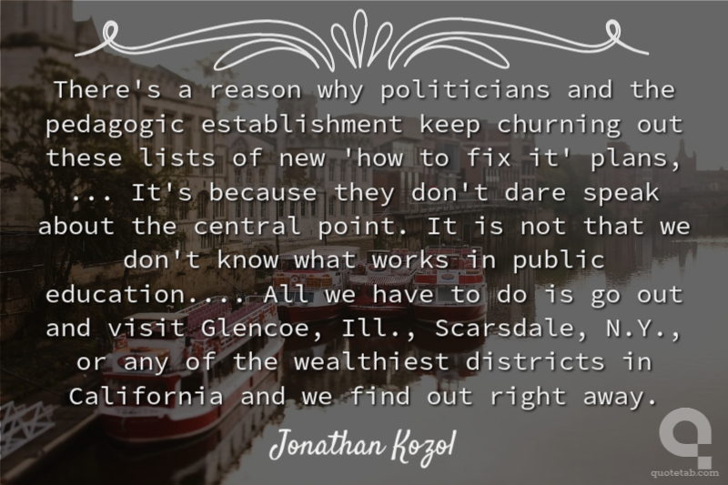 There's a reason why politicians and the pedagogic establishment keep churning out these lists of new 'how to fix it' plans, ... It's because they don't dare speak about the central point. It is not that we don't know what works in public education.... All we have to do is go out and visit Glencoe, Ill., Scarsdale, N.Y., or any of the wealthiest districts in California and we find out right away.