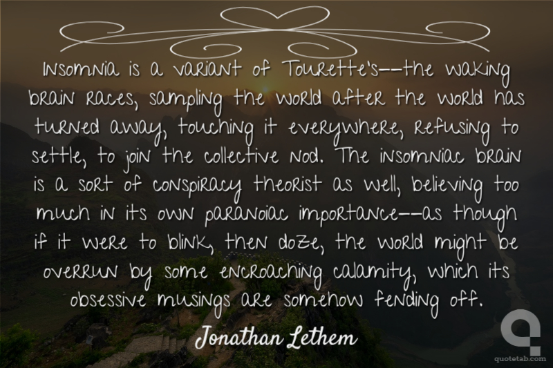 Insomnia is a variant of Tourette's--the waking brain races, sampling the world after the world has turned away, touching it everywhere, refusing to settle, to join the collective nod. The insomniac brain is a sort of conspiracy theorist as well, believing too much in its own paranoiac importance--as though if it were to blink, then doze, the world might be overrun by some encroaching calamity, which its obsessive musings are somehow fending off.