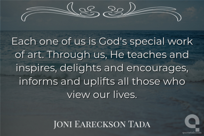 Each one of us is God's special work of art. Through us, He teaches and inspires, delights and encourages, informs and uplifts all those who view our lives.