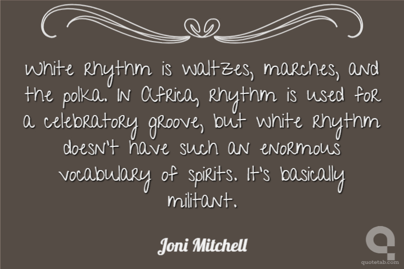 White rhythm is waltzes, marches, and the polka. In Africa, rhythm is used for a celebratory groove, but white rhythm doesn't have such an enormous vocabulary of spirits. It's basically militant.
