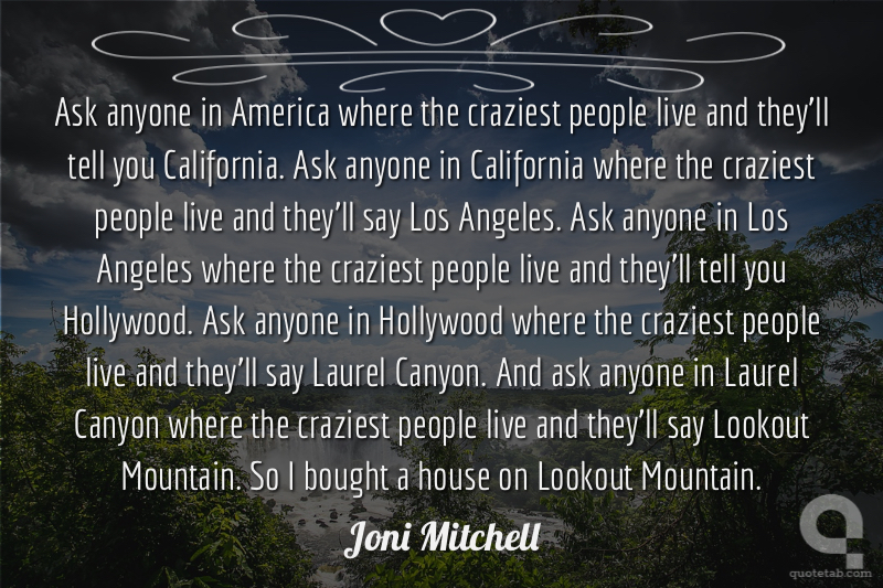 Ask anyone in America where the craziest people live and they'll tell you California. Ask anyone in California where the craziest people live and they'll say Los Angeles. Ask anyone in Los Angeles where the craziest people live and they'll tell you Hollywood. Ask anyone in Hollywood where the craziest people live and they'll say Laurel Canyon. And ask anyone in Laurel Canyon where the craziest people live and they'll say Lookout Mountain. So I bought a house on Lookout Mountain.