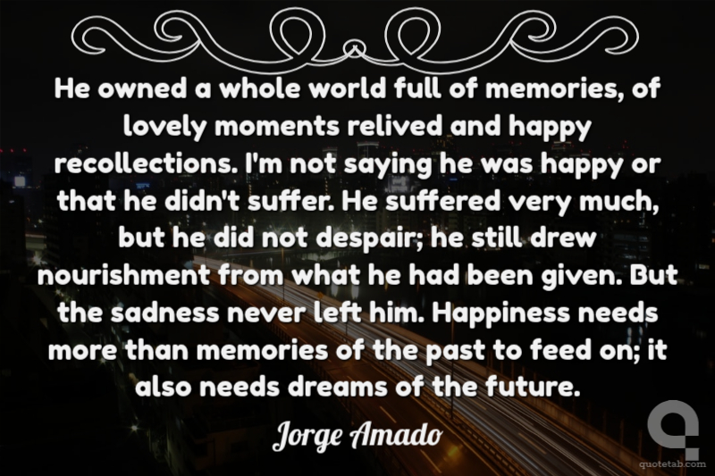 He owned a whole world full of memories, of lovely moments relived and happy recollections. I'm not saying he was happy or that he didn't suffer. He suffered very much, but he did not despair; he still drew nourishment from what he had been given. But the sadness never left him. Happiness needs more than memories of the past to feed on; it also needs dreams of the future.