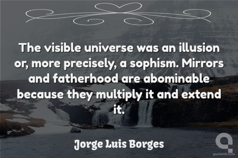 The visible universe was an illusion or, more precisely, a sophism. Mirrors and fatherhood are abominable because they multiply it and extend it.