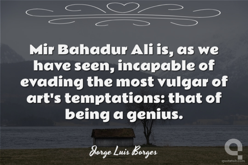 Mir Bahadur Ali is, as we have seen, incapable of evading the most vulgar of art's temptations: that of being a genius.