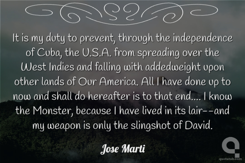 It is my duty to prevent, through the independence of Cuba, the U.S.A. from spreading over the West Indies and falling with addedweight upon other lands of Our America. All I have done up to now and shall do hereafter is to that end.... I know the Monster, because I have lived in its lair--and my weapon is only the slingshot of David.