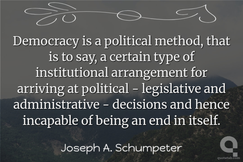 Democracy is a political method, that is to say, a certain type of institutional arrangement for arriving at political - legislative and administrative - decisions and hence incapable of being an end in itself.