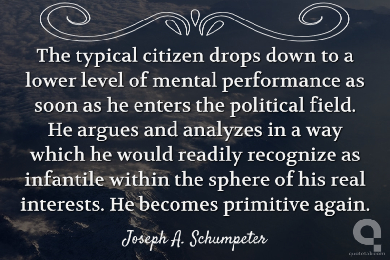 The typical citizen drops down to a lower level of mental performance as soon as he enters the political field. He argues and analyzes in a way which he would readily recognize as infantile within the sphere of his real interests. He becomes primitive again.