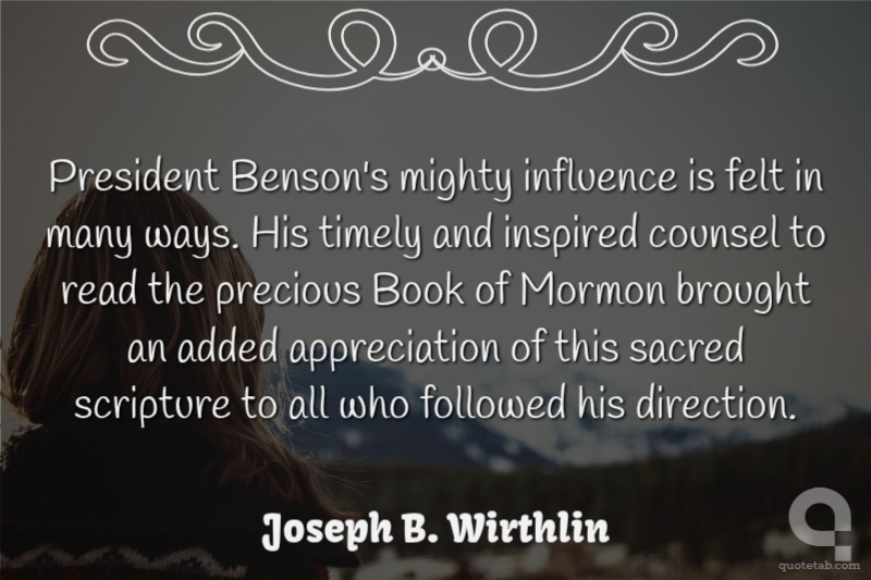 President Benson's mighty influence is felt in many ways. His timely and inspired counsel to read the precious Book of Mormon brought an added appreciation of this sacred scripture to all who followed his direction.