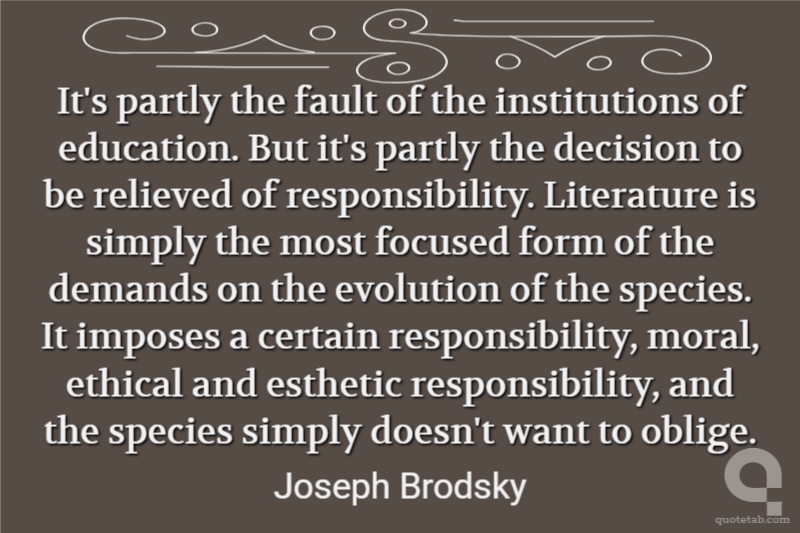 It's partly the fault of the institutions of education. But it's partly the decision to be relieved of responsibility. Literature is simply the most focused form of the demands on the evolution of the species. It imposes a certain responsibility, moral, ethical and esthetic responsibility, and the species simply doesn't want to oblige.