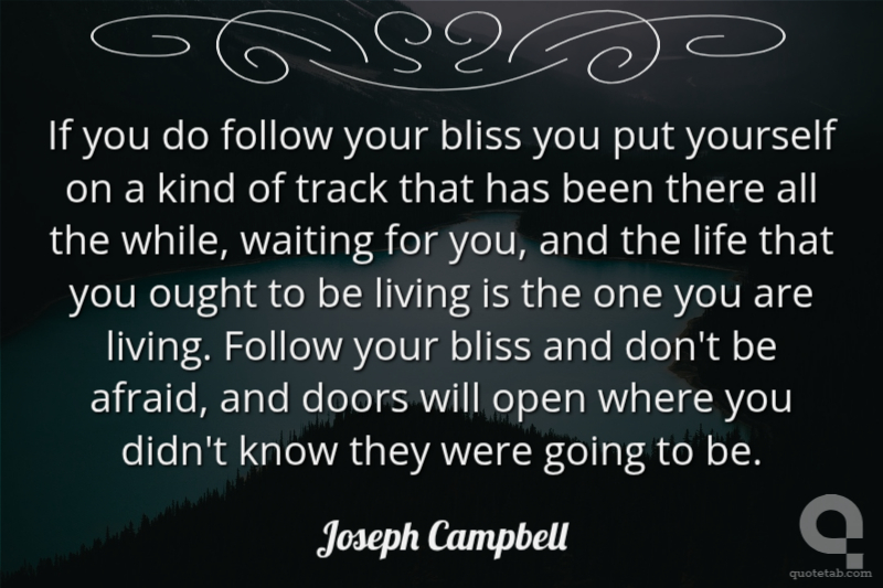 If you do follow your bliss you put yourself on a kind of track that has been there all the while, waiting for you, and the life that you ought to be living is the one you are living. Follow your bliss and don't be afraid, and doors will open where you didn't know they were going to be.