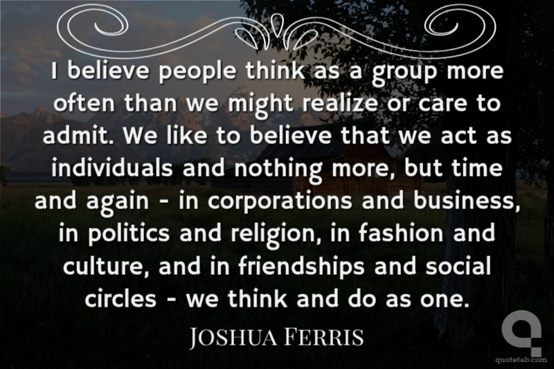 I believe people think as a group more often than we might realize or care to admit. We like to believe that we act as individuals and nothing more, but time and again - in corporations and business, in politics and religion, in fashion and culture, and in friendships and social circles - we think and do as one.