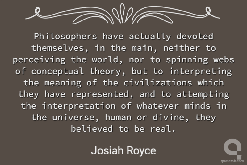 Philosophers have actually devoted themselves, in the main, neither to perceiving the world, nor to spinning webs of conceptual theory, but to interpreting the meaning of the civilizations which they have represented, and to attempting the interpretation of whatever minds in the universe, human or divine, they believed to be real.