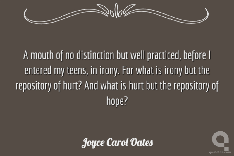 A mouth of no distinction but well practiced, before I entered my teens, in irony. For what is irony but the repository of hurt? And what is hurt but the repository of hope?