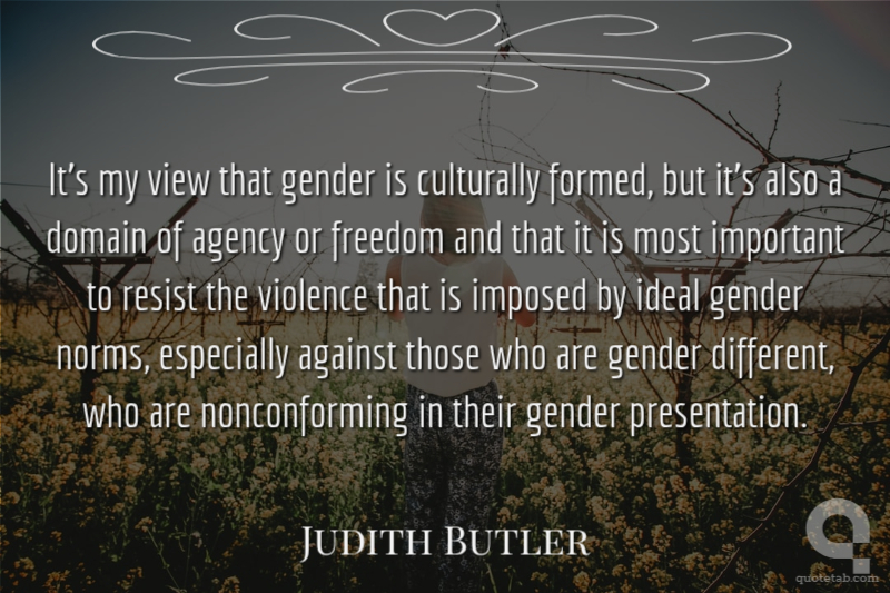 It's my view that gender is culturally formed, but it's also a domain of agency or freedom and that it is most important to resist the violence that is imposed by ideal gender norms, especially against those who are gender different, who are nonconforming in their gender presentation.
