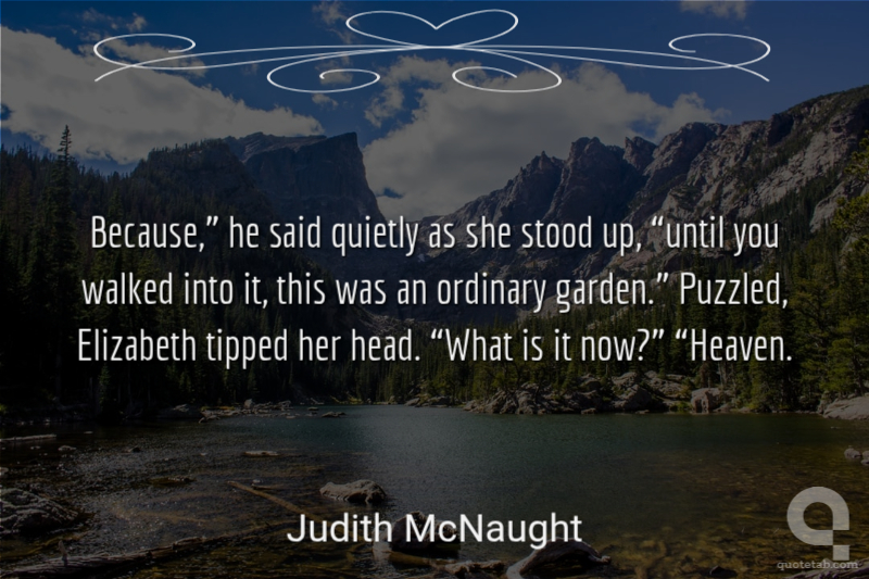 Because,” he said quietly as she stood up, “until you walked into it, this was an ordinary garden.” Puzzled, Elizabeth tipped her head. “What is it now?” “Heaven.