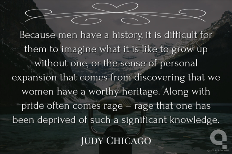 Because men have a history, it is difficult for them to imagine what it is like to grow up without one, or the sense of personal expansion that comes from discovering that we women have a worthy heritage. Along with pride often comes rage – rage that one has been deprived of such a significant knowledge.