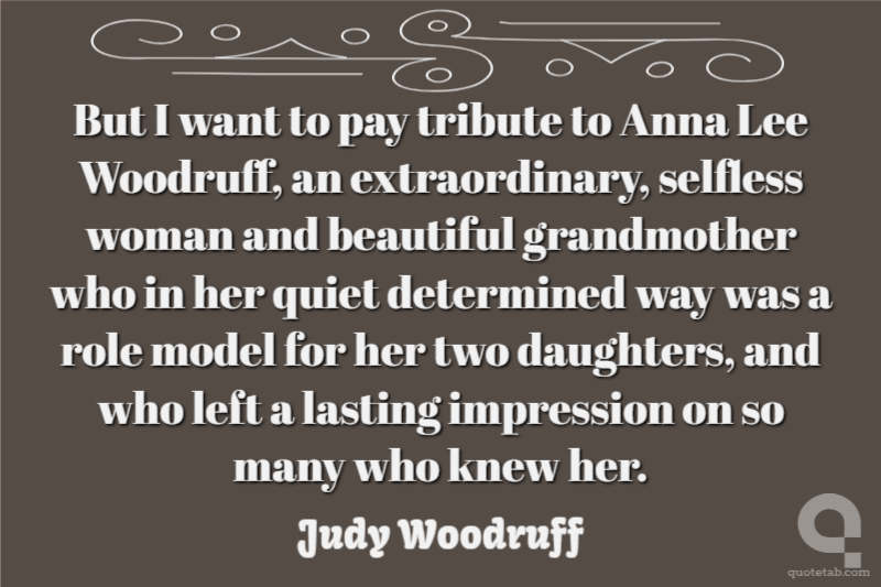 But I want to pay tribute to Anna Lee Woodruff, an extraordinary, selfless woman and beautiful grandmother who in her quiet determined way was a role model for her two daughters, and who left a lasting impression on so many who knew her.