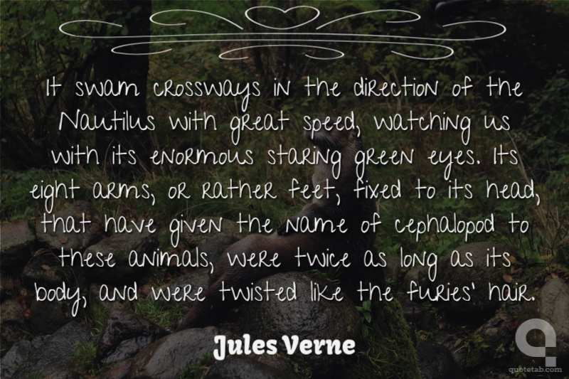 It swam crossways in the direction of the Nautilus with great speed, watching us with its enormous staring green eyes. Its eight arms, or rather feet, fixed to its head, that have given the name of cephalopod to these animals, were twice as long as its body, and were twisted like the furies' hair.