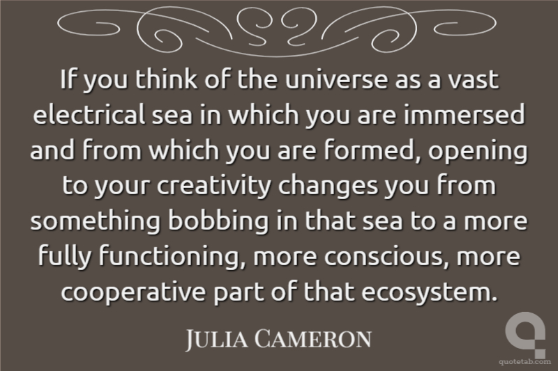 If you think of the universe as a vast electrical sea in which you are immersed and from which you are formed, opening to your creativity changes you from something bobbing in that sea to a more fully functioning, more conscious, more cooperative part of that ecosystem.