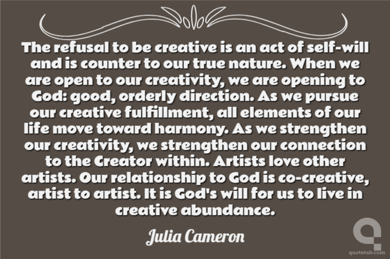 The refusal to be creative is an act of self-will and is counter to our true nature. When we are open to our creativity, we are opening to God: good, orderly direction. As we pursue our creative fulfillment, all elements of our life move toward harmony. As we strengthen our creativity, we strengthen our connection to the Creator within. Artists love other artists. Our relationship to God is co-creative, artist to artist. It is God's will for us to live in creative abundance.