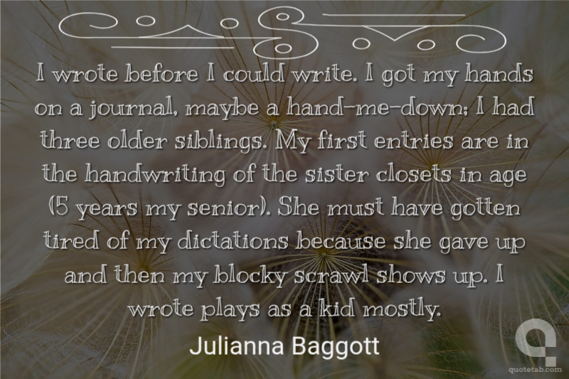 I wrote before I could write. I got my hands on a journal, maybe a hand-me-down; I had three older siblings. My first entries are in the handwriting of the sister closets in age (5 years my senior). She must have gotten tired of my dictations because she gave up and then my blocky scrawl shows up. I wrote plays as a kid mostly.