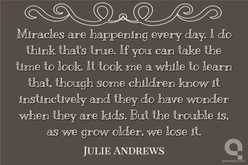 Miracles are happening every day. I do think that's true. If you can take the time to look. It took me a while to learn that, though some children know it instinctively and they do have wonder when they are kids. But the trouble is, as we grow older, we lose it.