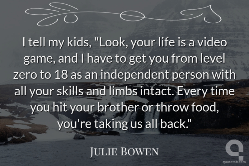 I tell my kids, "Look, your life is a video game, and I have to get you from level zero to 18 as an independent person with all your skills and limbs intact. Every time you hit your brother or throw food, you're taking us all back."