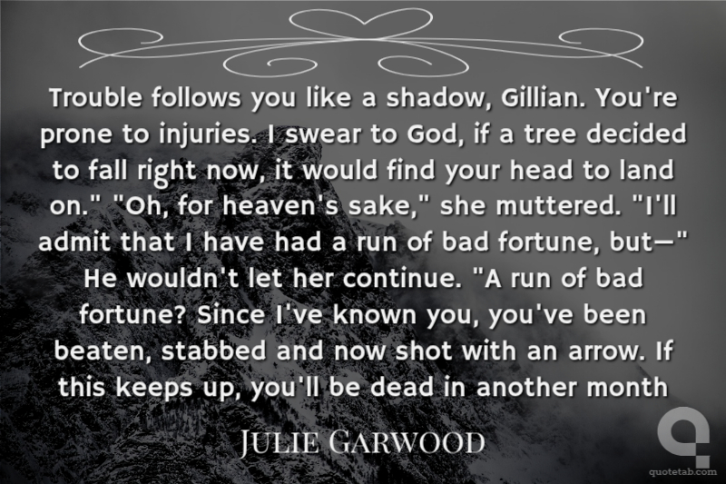 Trouble follows you like a shadow, Gillian. You're prone to injuries. I swear to God, if a tree decided to fall right now, it would find your head to land on." "Oh, for heaven's sake," she muttered. "I'll admit that I have had a run of bad fortune, but—" He wouldn't let her continue. "A run of bad fortune? Since I've known you, you've been beaten, stabbed and now shot with an arrow. If this keeps up, you'll be dead in another month