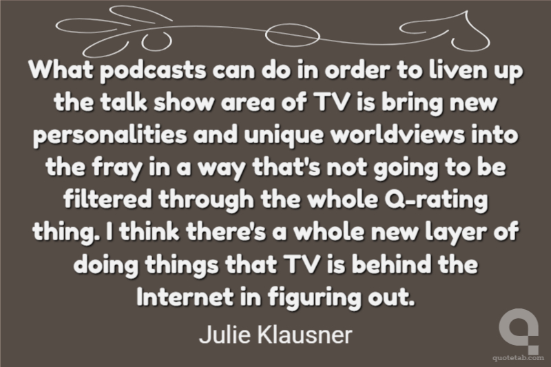 What podcasts can do in order to liven up the talk show area of TV is bring new personalities and unique worldviews into the fray in a way that's not going to be filtered through the whole Q-rating thing. I think there's a whole new layer of doing things that TV is behind the Internet in figuring out.