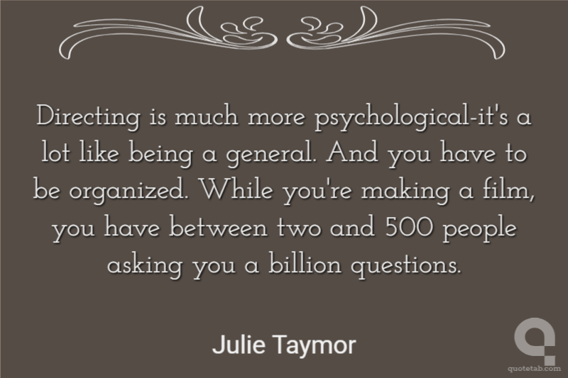 Directing is much more psychological-it's a lot like being a general. And you have to be organized. While you're making a film, you have between two and 500 people asking you a billion questions.