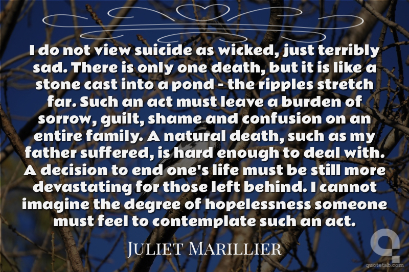 I do not view suicide as wicked, just terribly sad. There is only one death, but it is like a stone cast into a pond - the ripples stretch far. Such an act must leave a burden of sorrow, guilt, shame and confusion on an entire family. A natural death, such as my father suffered, is hard enough to deal with. A decision to end one's life must be still more devastating for those left behind. I cannot imagine the degree of hopelessness someone must feel to contemplate such an act.