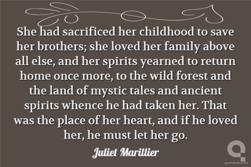 She had sacrificed her childhood to save her brothers; she loved her family above all else, and her spirits yearned to return home once more, to the wild forest and the land of mystic tales and ancient spirits whence he had taken her. That was the place of her heart, and if he loved her, he must let her go.