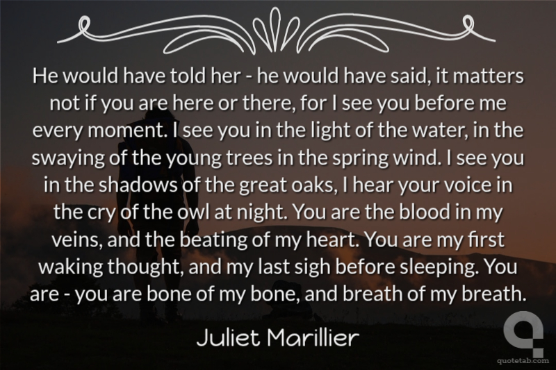 He would have told her - he would have said, it matters not if you are here or there, for I see you before me every moment. I see you in the light of the water, in the swaying of the young trees in the spring wind. I see you in the shadows of the great oaks, I hear your voice in the cry of the owl at night. You are the blood in my veins, and the beating of my heart. You are my first waking thought, and my last sigh before sleeping. You are - you are bone of my bone, and breath of my breath.