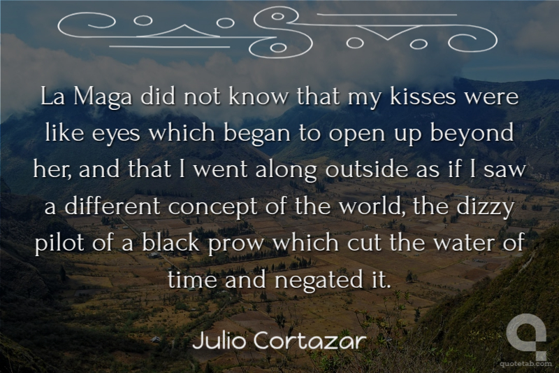 La Maga did not know that my kisses were like eyes which began to open up beyond her, and that I went along outside as if I saw a different concept of the world, the dizzy pilot of a black prow which cut the water of time and negated it.