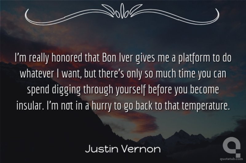 I'm really honored that Bon Iver gives me a platform to do whatever I want, but there's only so much time you can spend digging through yourself before you become insular. I'm not in a hurry to go back to that temperature.
